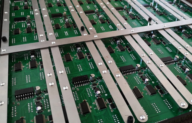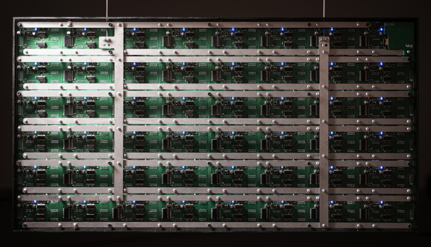 The power to the display comes from a steel lattice that also provides structural support for the PCBs. A 48V supply is connected to two lengths of steel wire that attach to the vertical bars, these then provide power to all the PCBs via the horizontal bars. A thin insulator is between some of the vertical and horizontal bars to prevent shorts.