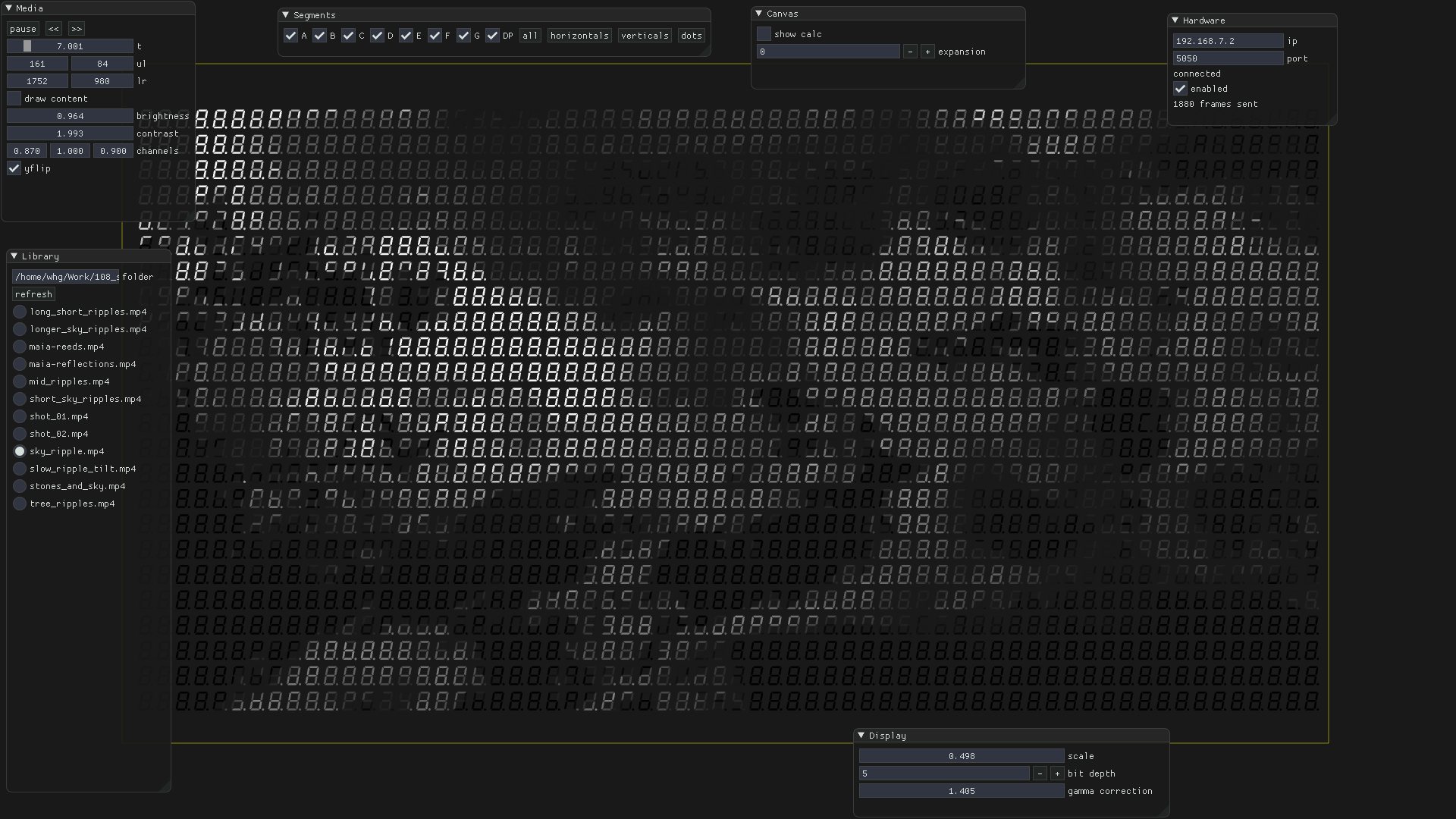 I wrote a C++ program (using the great Cinder framework) to read videos and images and work out how the segments should be lit. Within the program, you can load media, move it around and control playback. There are also options for gamma correction, bit depth and how to convert colour to grayscale.
