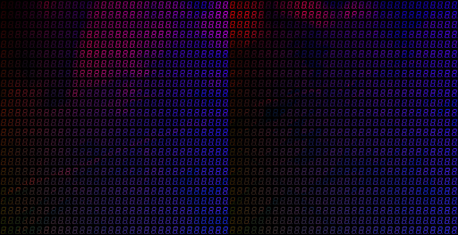 I achieve a number of grayscale levels by using binary code modulation. I wanted to get 8 bits of colour depth on the segments, but given the arrangement of the PCBs and the fact that the LEDs are already multiplexed (only an eighth of the LEDs are on at any one time), I couldn’t get this much depth without getting a very noticeable flicker. In the end I had to settle for 5 bits, so 32 levels, but of course in reality it was less because of the non linearity of our perception of LEDs.